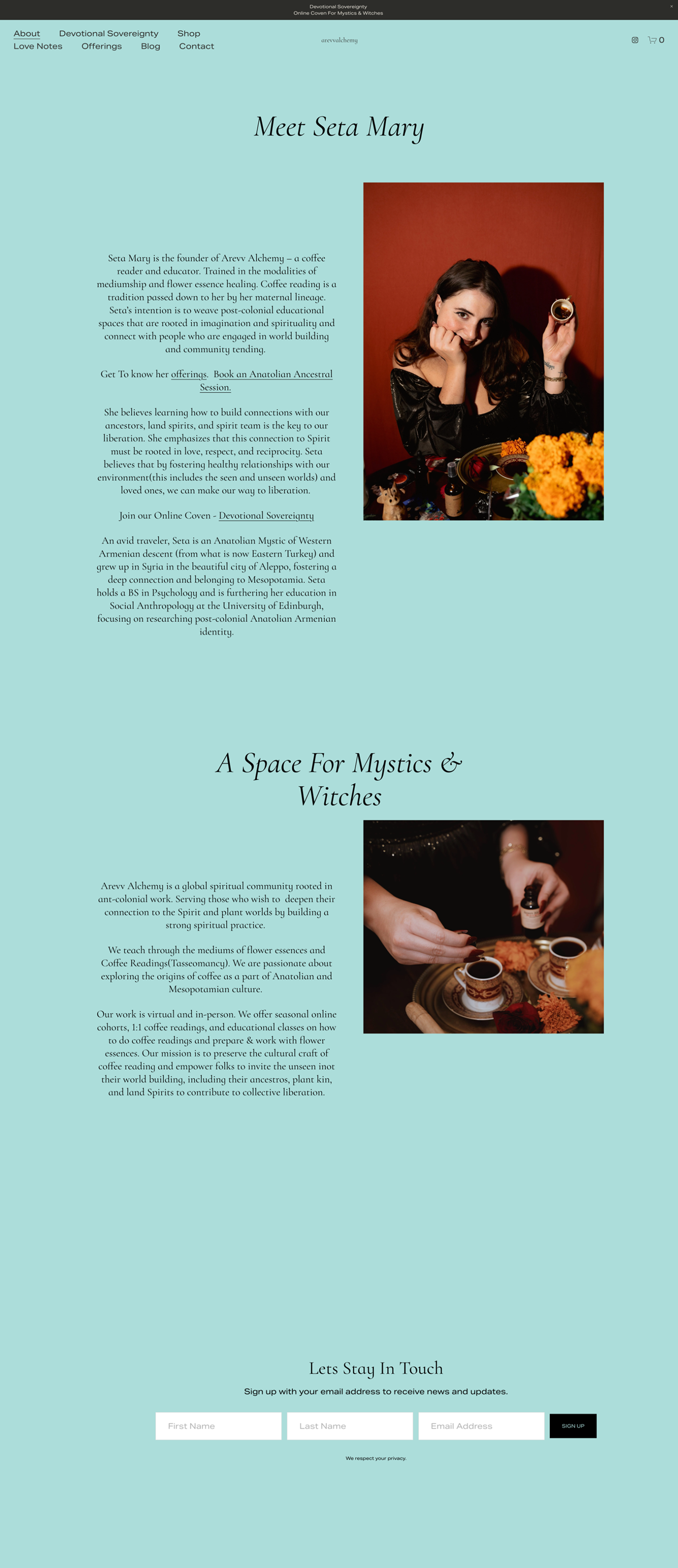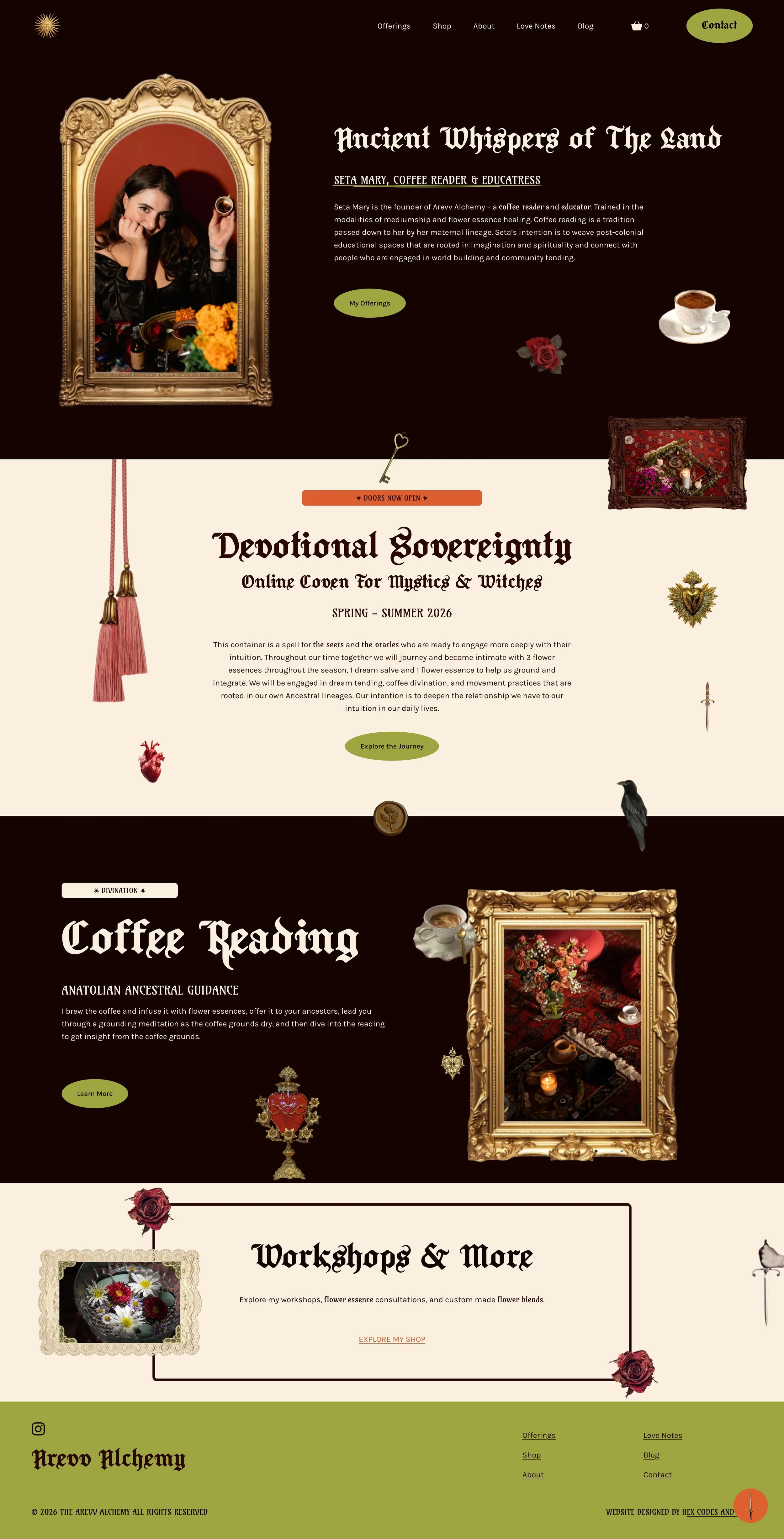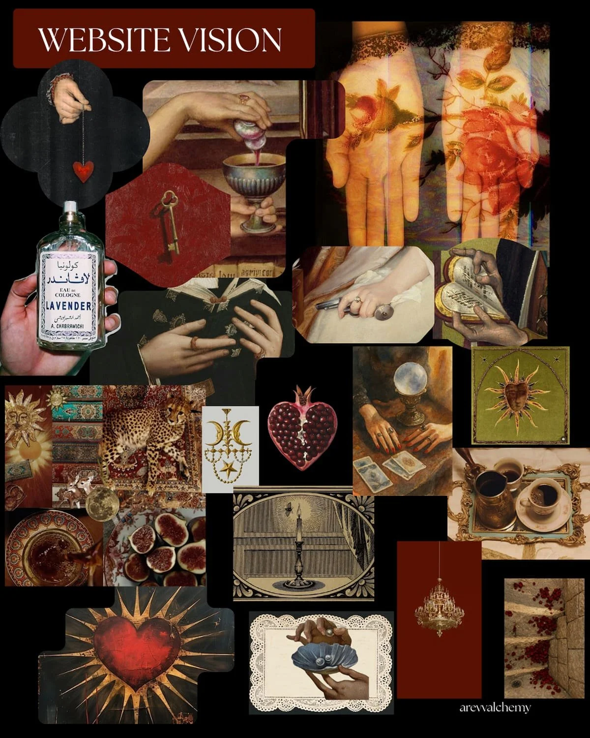 This website redesign and mini visual brand make over was guided by Arevv Alchemy’s brand muses, this beautiful mood board Seta created, and leaning into the vision and feel of entering a rich grandma’s house.