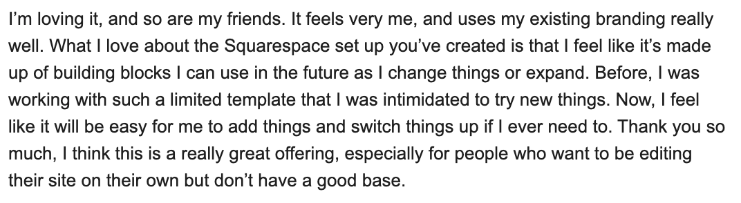 Their site’s bounce rate decreased by 25%, they received more inquiries about their work, an increase in folx reaching out to connect, and more bookings. Lastly, their site feels energetically aligned with their brand. Which is what we set out to accomplish.