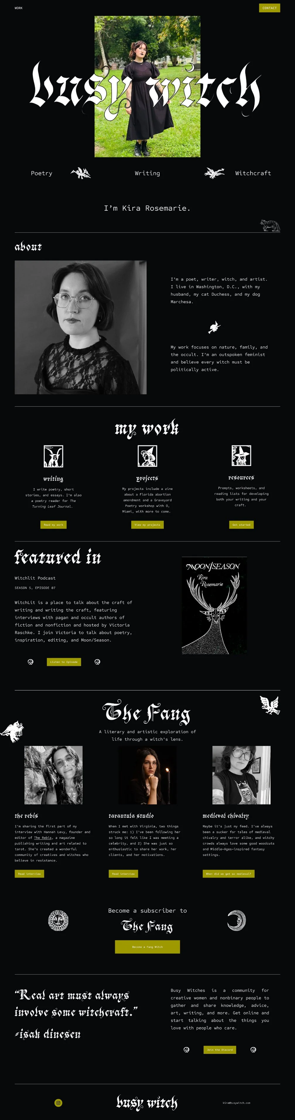 Kira Rosemarie, Bust Witch, is a poet, writer, witch, and artist. Her work focuses on nature, family, and the occult. She’s an outspoken feminist and believes every witch must be politically active.
